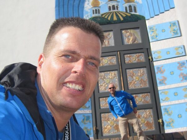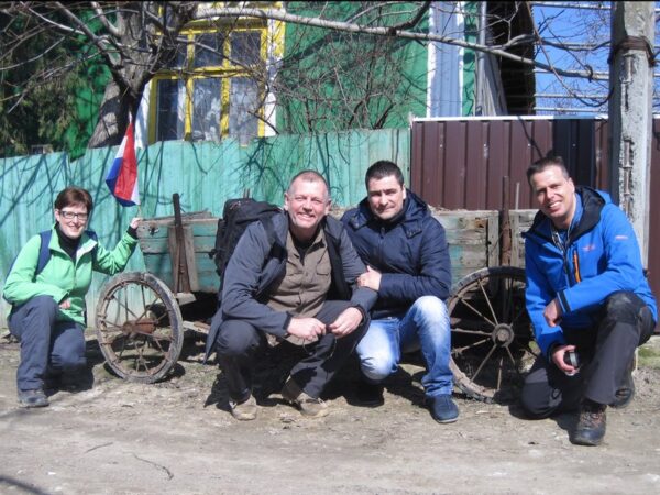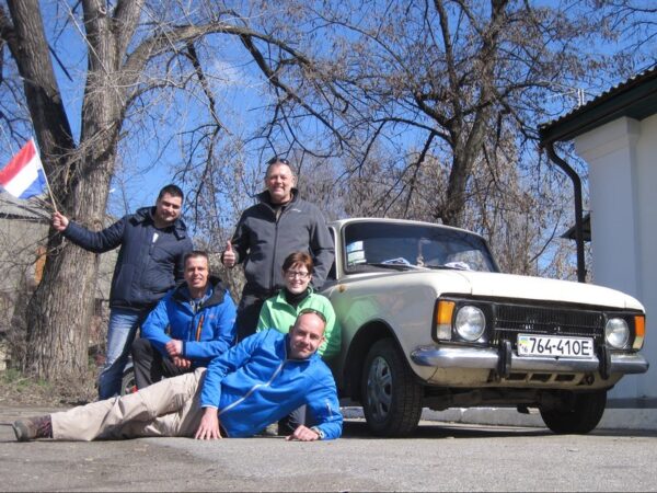 Een rit langs een immense staalfabriek bracht het team sneller dan gedacht bij de grens. Daar begon het wachten. Langzaam maar zeker en via diverse slagbomen, paspoortcontroles en douane-beambten schuifelde de witte Dacia dan toch Moldavië in. Aan boord vier glimlachende Geofriends en een enthousiaste chauffeur. Na een korte rit vol verbazing over de omgeving kwam de event-locatie in zicht. Het was even zoeken. De op een internet-afbeelding beloofde kerk liet zich niet vinden. Later bleek het om slechts een wegkruis te gaan. Dat mocht de pret niet drukken en iets later dan gepland, door oponthoud aan de grens, kon het event beginnen. Buiten de Geofriends werd het event “Meet & Greet the Dutch Geofriends in Moldavia” alleen bezocht door George. Toch was het een reuze-gezellig samenzijn.