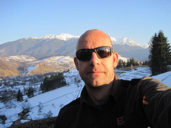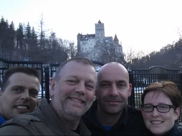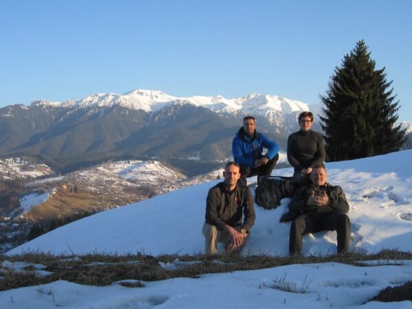 Bij aankomst was het slot zelf al gesloten. De cache “Dracula’s Castle“ gaf zich niet zomaar gevonden. Na een behoorlijke klimpartij, waarbij een tweetal lokale honden het de Geofriends niet makkelijker maakten, konden dan toch de namen in het logboekje van de oudste cache in Roemenië geschreven worden. En hé, wat een mooi uitzicht! Zo werd er ook op deze locatie spontaan een fotoshoot ingepland. Schitterend, deze besneeuwde top! De tocht terug naar de auto ging aanzienlijk makkelijker. Daardoor bleef er tijd over om even de toeristenmarkt over te wandelen. Een koelkastmagneet en een t-shirt later zat het team weer in de auto. Op naar een eetgelegenheid. Het was immers al weer avond geworden.
