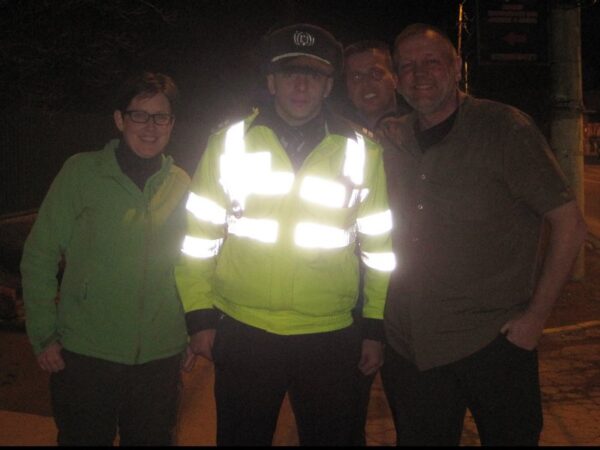 Zo’n 150 verder dan waar geparkeerd was werd het viertal staandegehouden door een Politie-agent. Het probleem was dat, bij het uitrijden, een doorgetrokken streep was overgestoken. “Maar agent. Dat kan toch niet anders als ik terug moet naar mijn eigen rijbaan!?” Uiteindelijk moesten de papieren even goed bestudeerd worden in de Politie-auto. In de minuten dat dit duurde hadden de Geofriends de grootste lol. Feit is dat de Roemenen nogal opportuun autorijden. Daar waar plek is rijden ze. En dan zouden een stel Hollandse cachers bekeurd worden!? Alles bleef natuurlijk mogelijk. Gelukkig was daar de agent weer. Met papieren. Er kon doorgereden worden. Daar was bestuurder Jan het dus niet mee eens! Hij wilde met de Politieman op de foto. Van alle aanwezigen schrok de agent waarschijnlijk nog het meest van deze twist. In zijn schrik ging hij akkoord met het maken van een foto. Nu kon dan echt de reis naar Boekarest worden aangevangen.